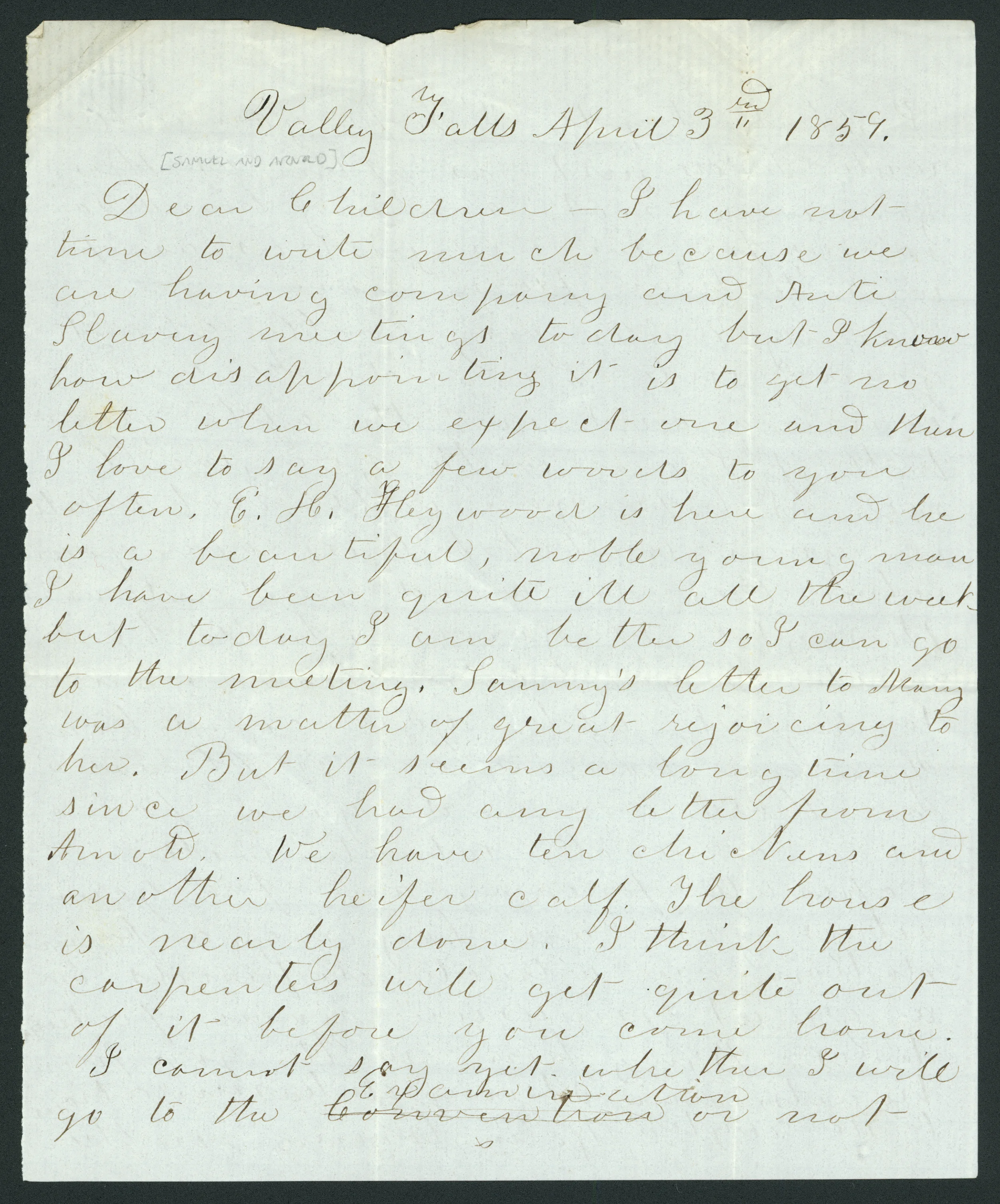 Dear Children--I have not time to write much because we are having company and Antislavery meetings today but I know how disappointing it is to get no letter when we expect one and then I have a few words to say to you often. E.H. Heywood is here and he is a beautiful, noble, young man. I have been quite ill all the week but today I am better so I can go to the meeting. Sammy’s letter to Mary was a matter of great rejoicing to her. But it seems a long time since we had any letter from Arnold. We have ten chickens and another heifer calf. The house is nearly done. I think the carpenters will get quite out of it before you come home. I cannot say yet whether I will go to the Emancipation or not I shall try to. I hope you will write to us just as after as though (?) you were not coming home so soon; for, we were just as anxious to hear from you.