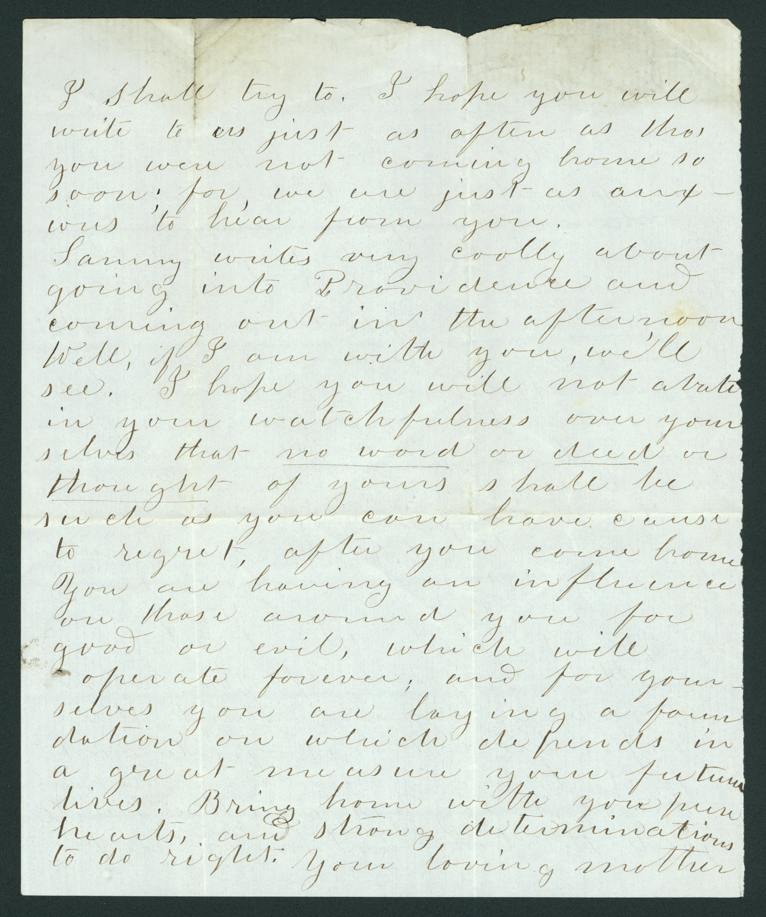 Sammy writes very coolly about going into Providence and coming out in the afternoon. Well, if I am with you, we’ll see. I hope you will not abate in your watchfulness over yourselves that no word or deed or thought of your shall be such as you can have cause to regret, after you come home. You are having an influence on those around you for good or evil, which will operate forever; and for yourselves you are laying a foundation on which defends in a great measure your future lives. Bring home with you pure hearts, and strong determinations to do right.
