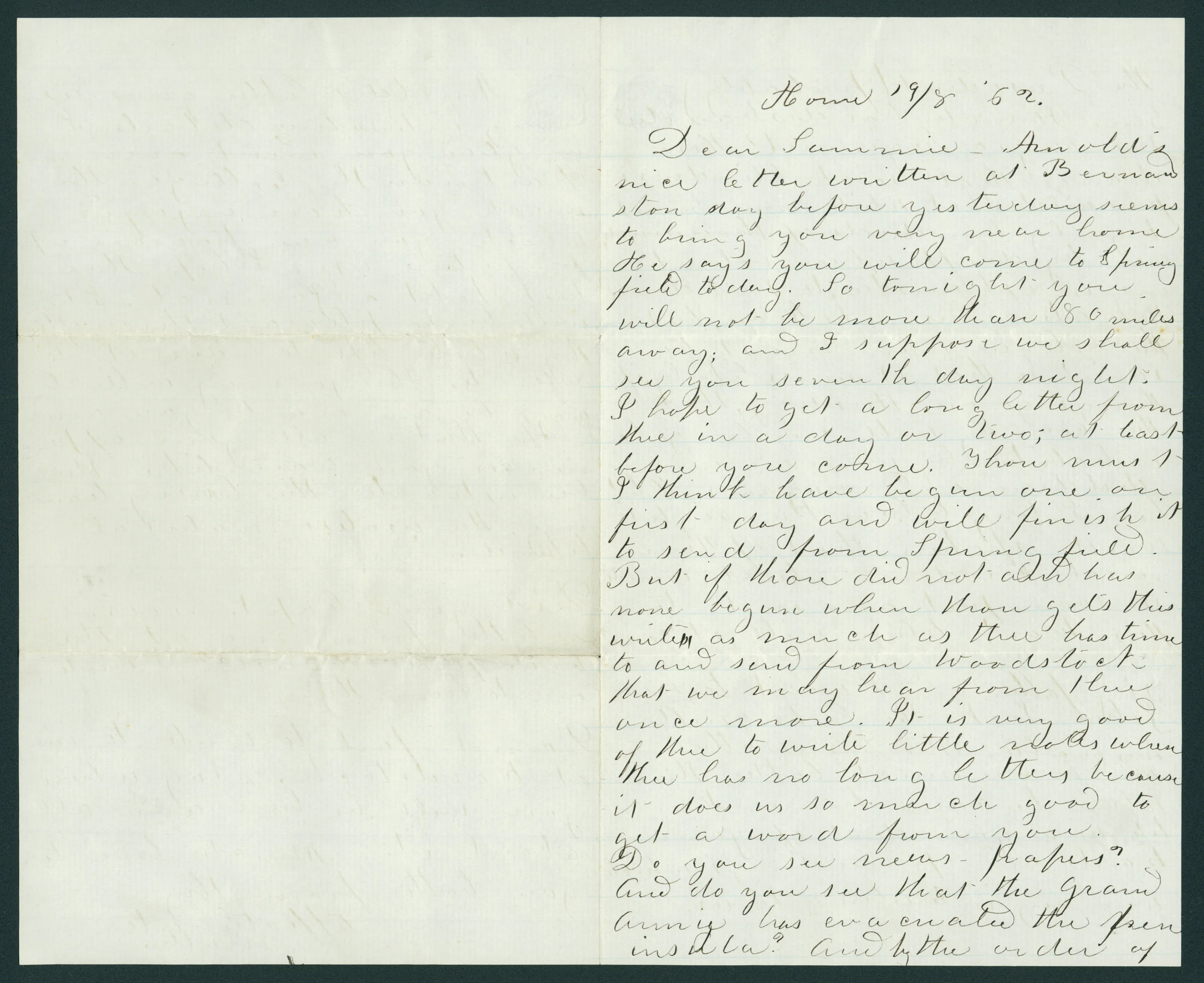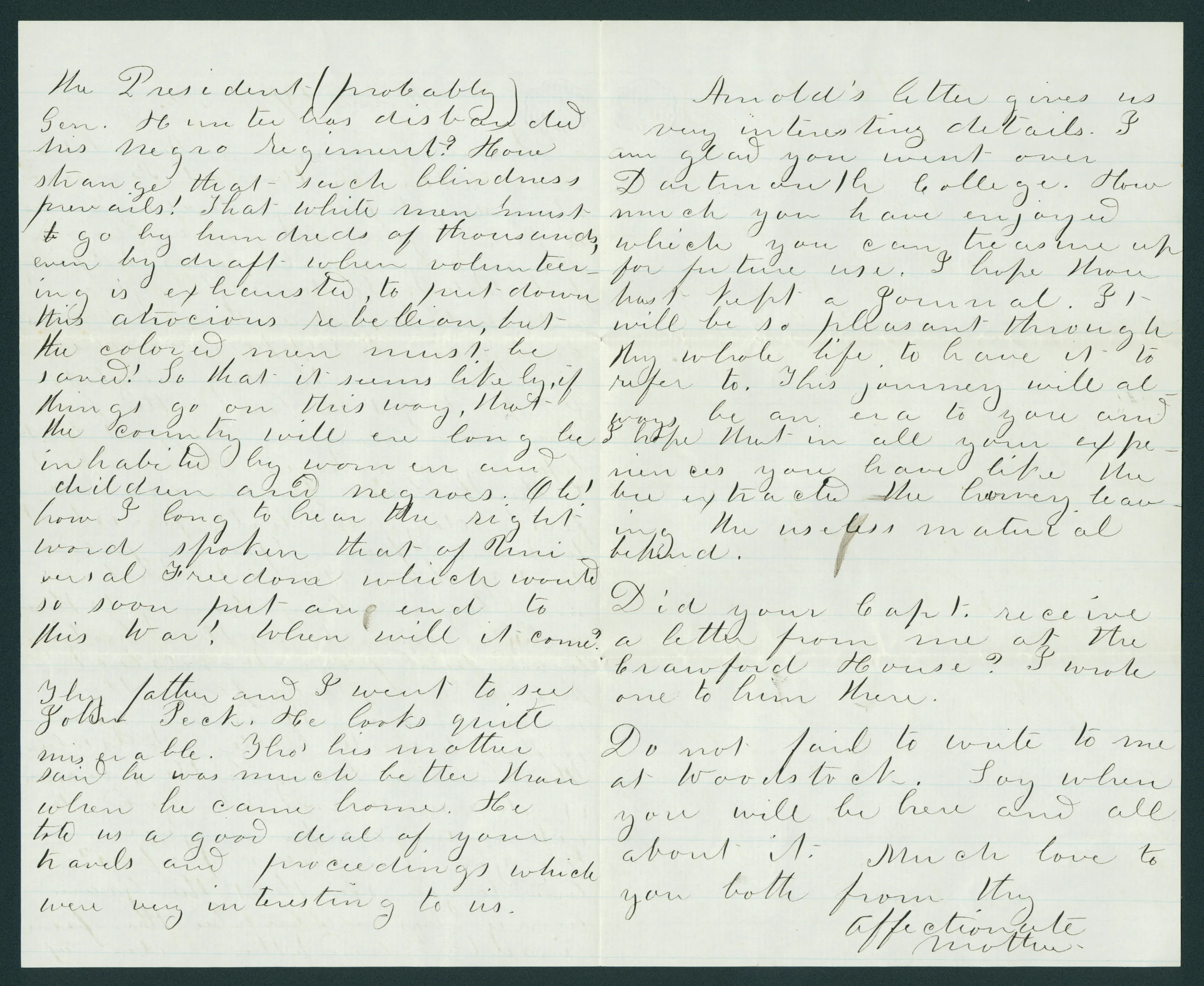 Dear Sammie--Arnold’s nice letter written at Bernardston day before yesterday seems to him & you very near home. He says you will come to Springfield today. So tonight you will not be more than 80 miles away; and I suppose we shall see you seventh day night. I hope to get a loving letter from thee in a day or two; at least before you come. Thou must I think have begun one on first day and will finish it to send from Springfield. But if those did not and has non begun when though gets this written as much as thee has time to and send from Woodstock that we may hear from thee once more. It is very good of thee to write little notes where thee has no long letters because it does us so much good to get a word from you. Do you see [...] perhaps? And do you see that the Grand Army has enacted the peninsula (?) ? And by the order of the President (probably) Gen. Hunter has disbanded his Negro regiment? How strange that such blindness prevails! That white men must go by hundreds of thousands even by draft when volunteering is exhausted, to put down this atrocious rebellion, but the colored men must be saved! So that it seems likely if things go on this way, that the country will ere long be inhabited by women and children and negroes. Oh! how I long to hear the right word spoken that of Universal Freedom which would so soon put an end to this war! When will it come? Thy father and I went to see John Peck. He looks quite miserable. Tho’ his mother said he was much better than when he came home. He told us a good deal of your travels and proceedings which were very interesting to us.
